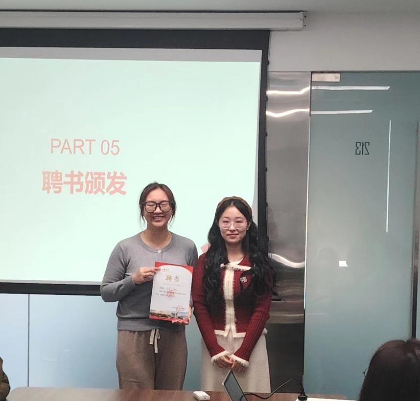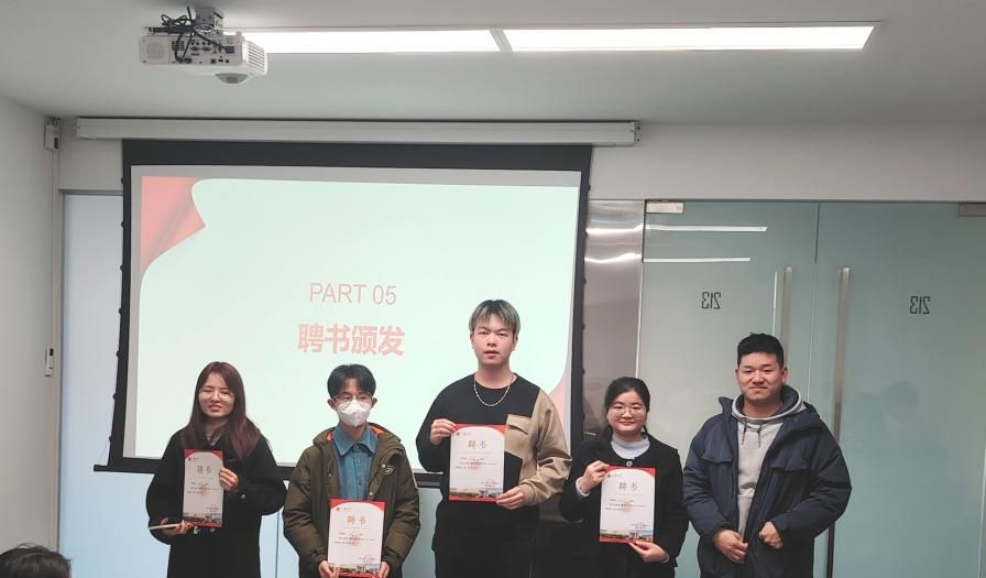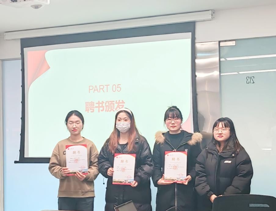 参加新一轮部长换届竞选的候选人范泊远、周文琴、赵紫路、路慧、王嘉怡、孙宏、侯岩、巢天慧等同学分别从自身员工工作经历、对岗位的认识、竞选优势和未来工作设想等方面展开竞选演说,他们对自身良好精神面貌与硬核实力的精彩展示,以及希望通过参与研究生会工作服务广大同学、实现自我锻炼提升的强烈愿望得到了与会老师、研会主席团成员及部长们的一致认可。在大家热烈的掌声中,新任主席团成员和上一届部长代表共同为新任部长们颁发了聘书,新老交接顺利完成,大家一起合影留念。