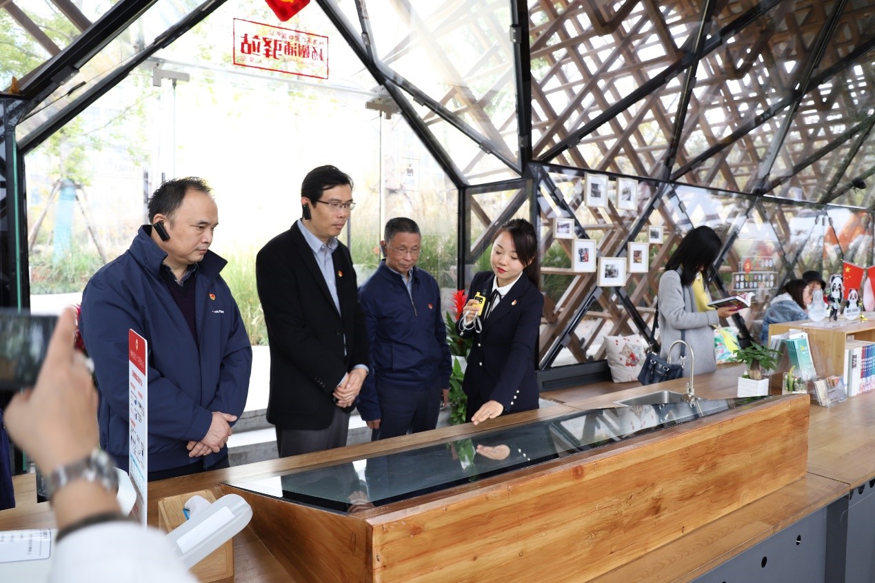 12时,全体人员来到杨浦滨江党群服务站杨树浦驿站人人屋站,认真聆听讲解员介绍服务站的建站初衷、建筑设计理念、功能布局设计以及运行情况。