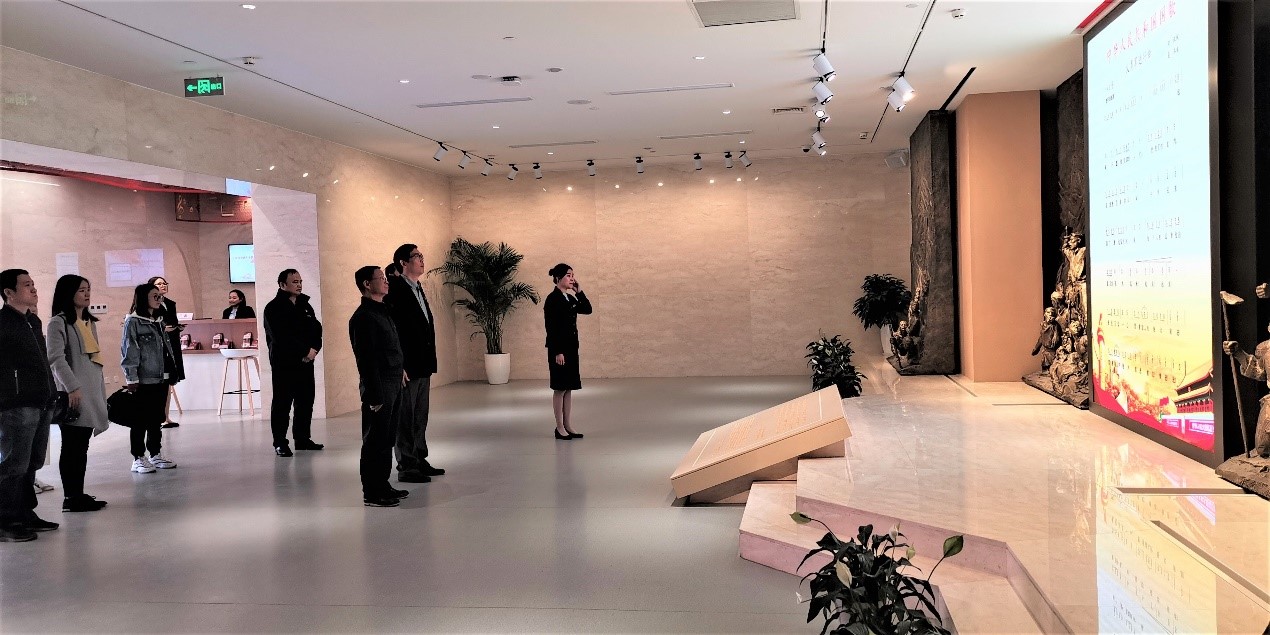 上午10时,在国歌展示馆序厅,随着国歌雄壮嘹亮的旋律响起,全体人员整装肃立、神情庄重,齐声高唱国歌。随后,在馆员引导讲解下,大家仔细参观了不同展区珍贵的影像资料、文物、文献,详细了解和感悟《义勇军进行曲》的诞生背景和过程、传唱和影响、词曲作者、被确定为国歌以及国歌故事。180°弧幕上,短片《行远不忘初心》一幕幕画面翻过,每一幕都深深触动着在场所有人。在短片结尾处,全体人员起立,再一次高唱国歌,每个人都热血沸腾、心潮澎湃。
