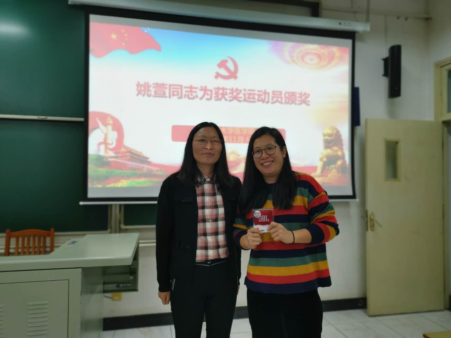 会前,姚萱副经理为第二十三届校运动会上斩获佳绩的陈祥慧同学颁发纪念品,并勉励全体研究生不断拼搏,砥砺奋进,继续为院、为校争光。