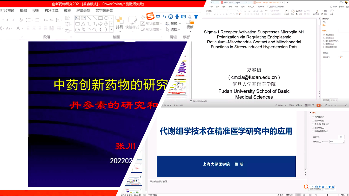 本次学术讲座主题为生物与医药,特邀请该领域的三位专家做专题报告。复旦大学基础402永利集团夏春梅副教授带来题为“Sigma-1 Receptor Activation Suppresses Microglia M1 Polarization via Regulating Endoplasmic Reticulum–Mitochondria Contact and Mitochondrial Functions in Stress-induced Hypertension Rats”的精彩讲座,她围绕心血管神经调控及机制等方面介绍了其课题组最新研究成果;张川教授聚焦中药创新药物的研究思路,介绍了丹参素的研究和开发;董昕副教授着重介绍了代谢组学技术在精准医学研究中的应用,分享了多组学研究在生物标志物筛选及发现、个体化治疗方案筛选及监测和生物学机制的探讨等方面的应用。
