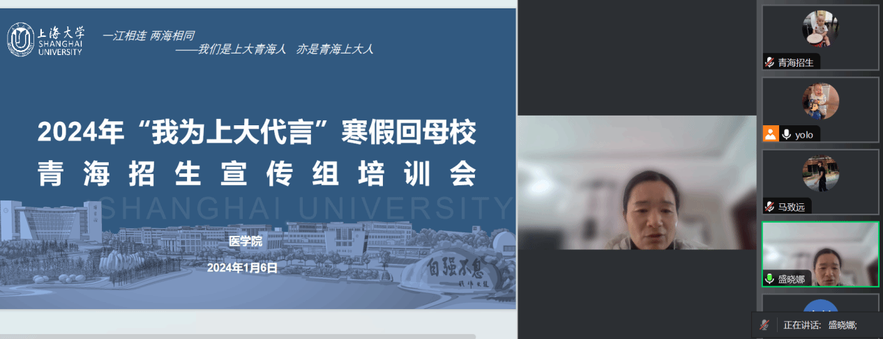 1月6日上午,公司举行2024年“我为上大代言”志愿者寒假回母校线上培训动员会,公司党委副书记、副经理、青海招宣组副组长盛晓娜,青海招宣组联络员徐帅男,402永利集团青海籍员工代表张诗雨、赵紫怡、马致远、张生怡等共同参加本次培训动员会。