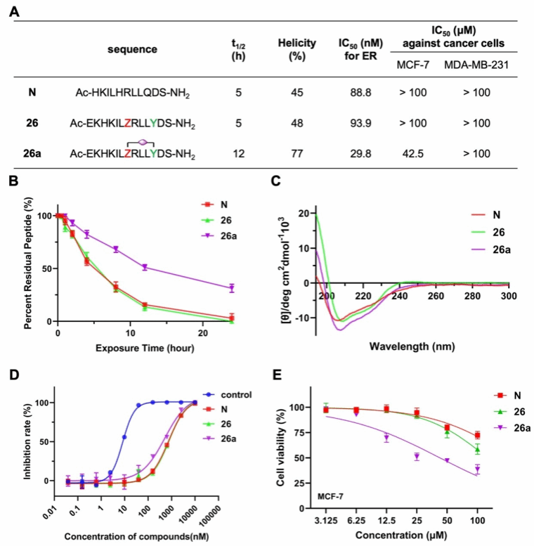 研究团队通过优化反应条件,发现Z-Y偶联产物比Y-Z产物更稳定,且具有更高的产率。此外,该方法成功应用于多种生物活性肽修饰,包括雌激素受体(ER)、MC4和GPR54多肽,与线性肽相比,显著提升了多肽的稳定性和生物活性(图2)。该技术突破了传统多肽订书化的局限性,为开发高稳定性、高活性的肽类药物提供了全新工具。