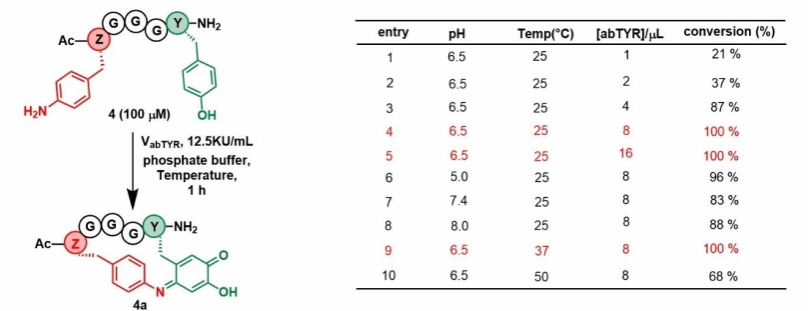 多肽的大环化订书修饰通常涉及重金属催化剂和有机溶剂的大量使用,在一定程度上限制了该类分子进一步的药物开发。研究团队受酪氨酸酶氧化机制启发,设计了一种对氨基苯丙氨酸(Z)与酪氨酸(Y)侧链交联的新方法。首先对反应条件进行了系统优化筛选,主要包括反应温度、pH 值和酪氨酸酶的用量,从而确定了最适合的反应条件(图1)。
