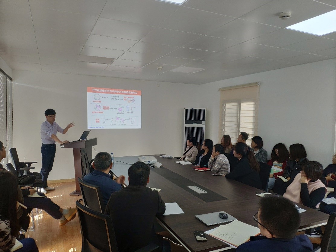 莫然教授通过诙谐幽默的语言,结合自己的研究成果,介绍了机体的生理特征以及肿瘤的异质性,递送系统从给药到靶点发挥作用需要克服多重生理及病理屏障,包括血液、肿瘤组织、细胞和胞内转运等屏障。重点讲解了课题组近年来如何针对药物递送屏障、肿瘤生理病理屏障设计新型智能药物递释系统,从而实现对药物的有效递送和肿瘤的高效安全治疗。并以课题组的研究成果:利用嗜中性粒细胞(neutrophil,NE)作为药物载体,运载脂质体包裹的化疗药物紫杉醇(paclitaxel,PTX),在小鼠中成功地抑制了手术后胶质母细胞瘤的复发为例,巧妙地利用嗜中性粒细胞对炎症的趋向性以及可穿越血脑屏障的特点,与肿瘤术后切除部位释放炎症因子相结合,实现药物高效的自主引导靶向递送。报告内容将学科前沿与科学研究紧密结合,并和员工就感兴趣的问题进行了现场交流,给出了详细的解答。