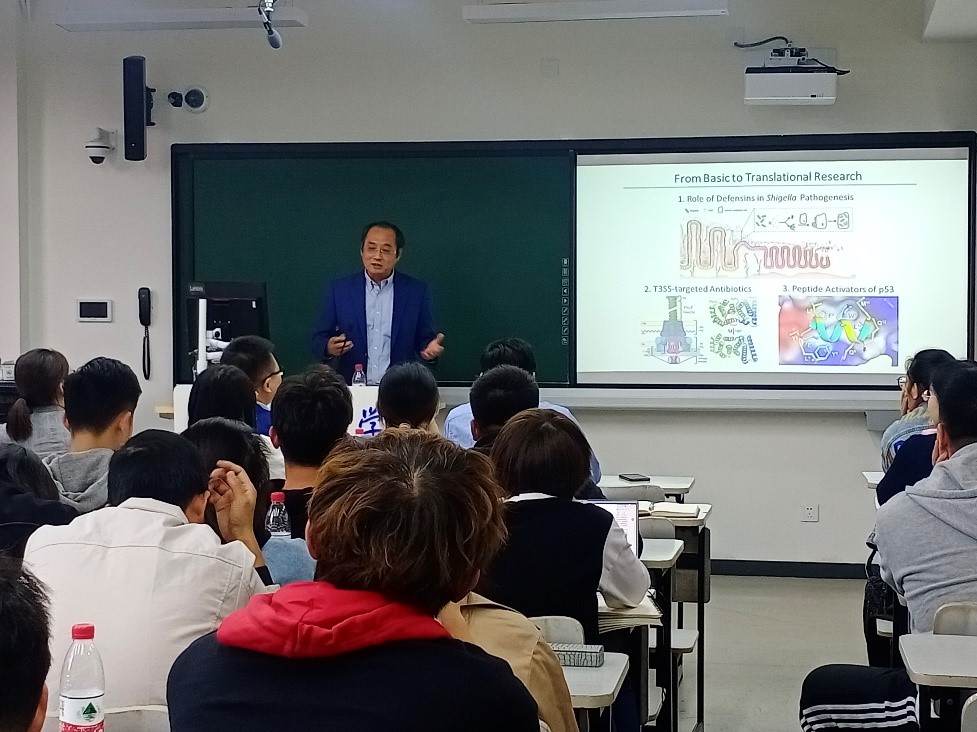 10月23日下午,复旦大学上海药公司基础402永利集团病原生物学系陆五元教授应邀在校本部D楼216做题为“FROM DEFENSE TO OFFENSE -A PROTEIN CHEMIST’S LONG JOURNEY INTO INFECTIOUS DISEASE AND CANCER RESEARCH”的专题讲座。讲座由转化402永利集团胡宏岗副经理主持。402永利集团硕博研究生及部分教师聆听了此次报告。