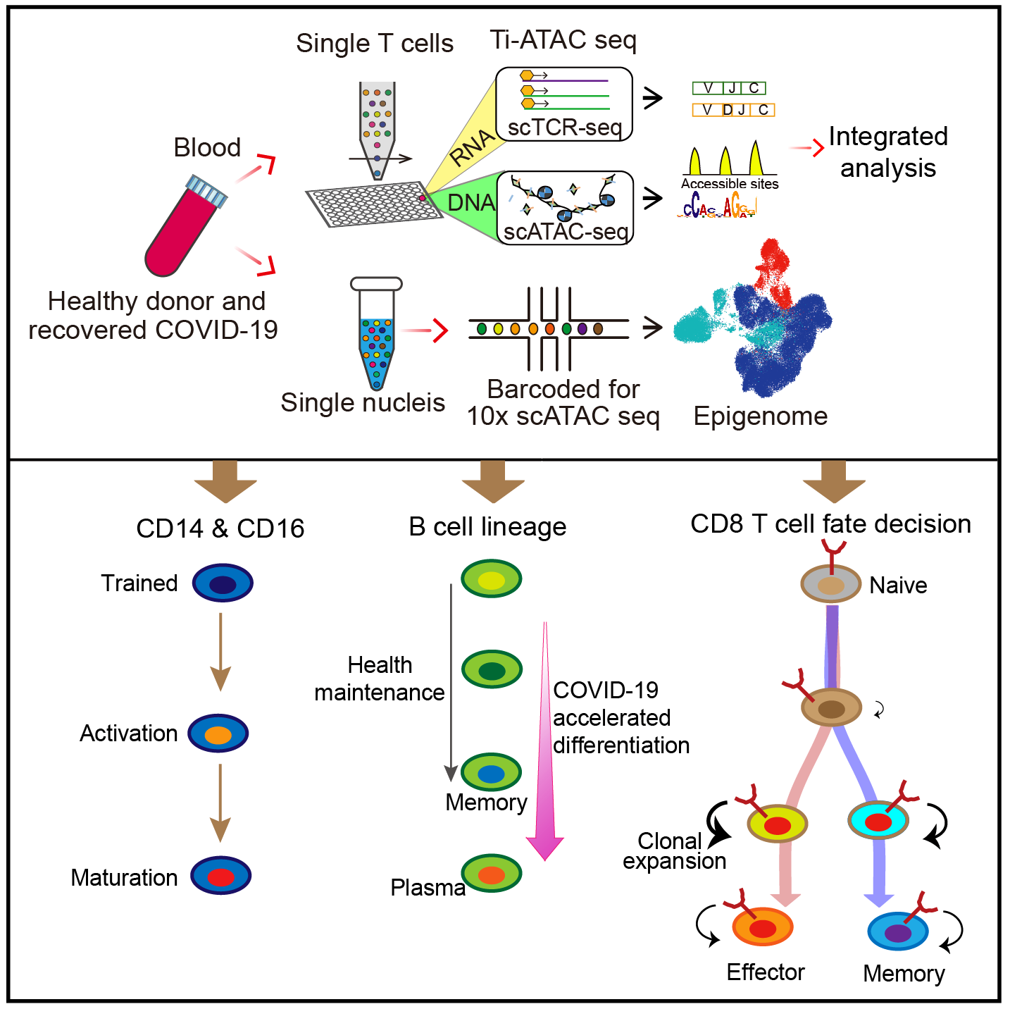 该工作通过单细胞ATAC-seq技术以及新开发的单细胞多组学Ti-ATAC-seq技术,描绘了新冠肺炎康复者外周免疫细胞可接近染色质多维图谱,解析了康复者中单核细胞,B细胞和T细胞免疫记忆形成的表观遗传机制。