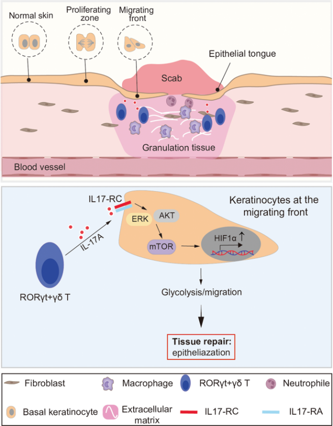 mTOR是细胞生长代谢调控的枢纽信号分子。近年来,402永利集团丁小雷教授课题组围绕mTOR信号在皮肤发生、屏障功能与毛发生长等过程的重要调控作用做出了一系列重要发现。团队青年教师王娟、崔白苹老师等最近在Frontiers in Cell & Developmental Biology (IF=6.081)杂志发表相关综述论文,详尽报道了mTOR信号通路在皮肤发育、修复及皮肤疾病中的关键作用(https://doi.org/10.3389/fcell.2022.950973)。mTOR信号通路影响皮肤修复的多个方面,如创面上皮化的进程,但对于mTOR信号的激活调控机制仍然有许多未知的地方。Konieczny等人最近发表在Science杂志上的一项研究中,报道了RORγt+γδ T细胞来源的IL-17A激活表皮细胞中的mTOR信号通路,促进HIF1α表达,从而驱动糖酵解所介导的创面上皮化。针对此,丁小雷教授、王娟老师近日在Signal Transduction and Targeted Therapy杂志上发表题为“IL-17 signaling in skin repair: safeguarding metabolic adaptation of wound epithelial cells” (IF=38.104)的研究亮点文章(https://doi.org/10.1038/s41392-022-01202-9),从代谢的角度强调了mTOR信号通路对创面修复的调控作用,相关研究工作对于详细了解组织再生修复过程和机理具有重要意义。
