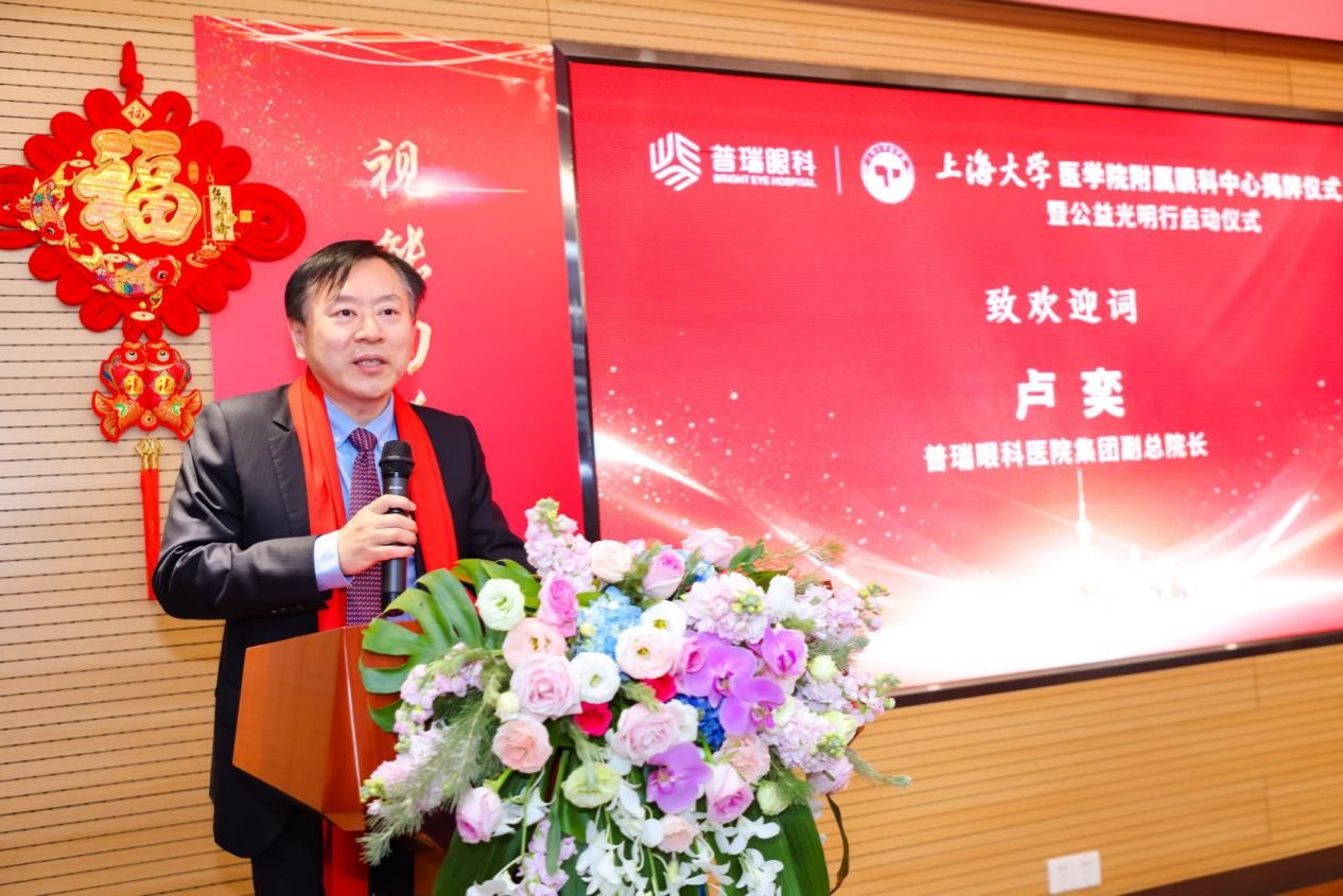 普瑞眼科医院集团副总经理卢奕致欢迎词,他表示,普瑞眼科品牌成立于2005年,是一家集医疗、教学、科研和眼健康服务为一体的专业连锁眼科医疗机构,在“全国连锁化+同城一体化”战略布局下,先后进驻24个中心城市投资运营了34家普瑞眼科医院、4家眼科门诊部。普瑞眼科将以此次揭牌为契机,深化与402永利集团的合作,共同致力于医疗领域高质量发展。双方将携手为患者提供更加优质、安全、高效且便捷的全方位个性化医疗服务,在技术革新和科研探索方面迈出坚实步伐,力求实现跨越式进步与发展。