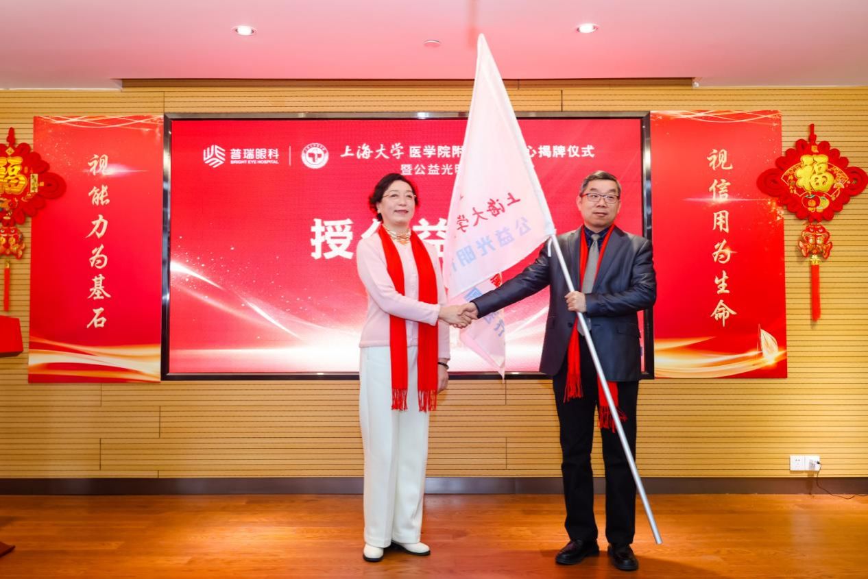 仪式上,“2025普瑞公益光明行”项目正式启动。与会领导共同点亮启动球。上海市慈善基金会长宁代表处副会长兼秘书长张国蕊女士为公益光明行志愿医疗队授旗,上海普瑞眼科医院业务副经理戴南平接受授旗。